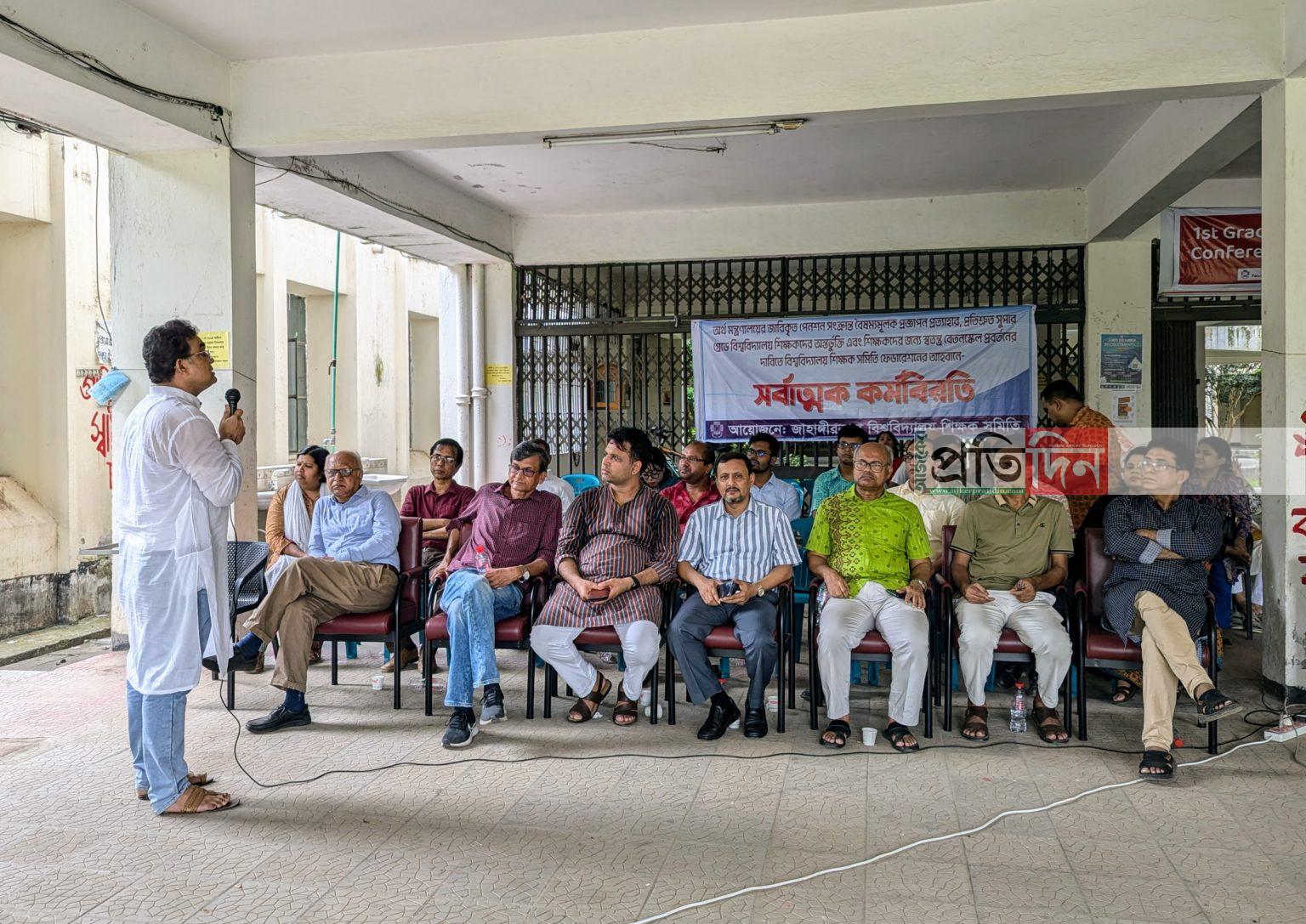 সাভার (ঢাকা) প্রতিনিধি || অর্থ মন্ত্রণালয়ের জারিকৃত পেনশন সংক্রান্ত বৈষম্যমূলক প্রজ্ঞাপন প্রত্যাহার, প্রতিশ্রুত সুপার গ্রেডে বিশ্ববিদ্যালয় শিক্ষকদের অন্তর্ভুক্তি এবং শিক্ষকদের জন্য স্বতন্ত্র বেতন স্কেল প্রবর্তনের দাবিতে বিশ্ববিদ্যালয় শিক্ষক সমিতি ফেডারেশনের আহব্বানে সর্বাত্মক কর্মবিরতি পালন করছে জাহাঙ্গীরনগর বিশ্ববিদ্যালয় শিক্ষক সমিতি।