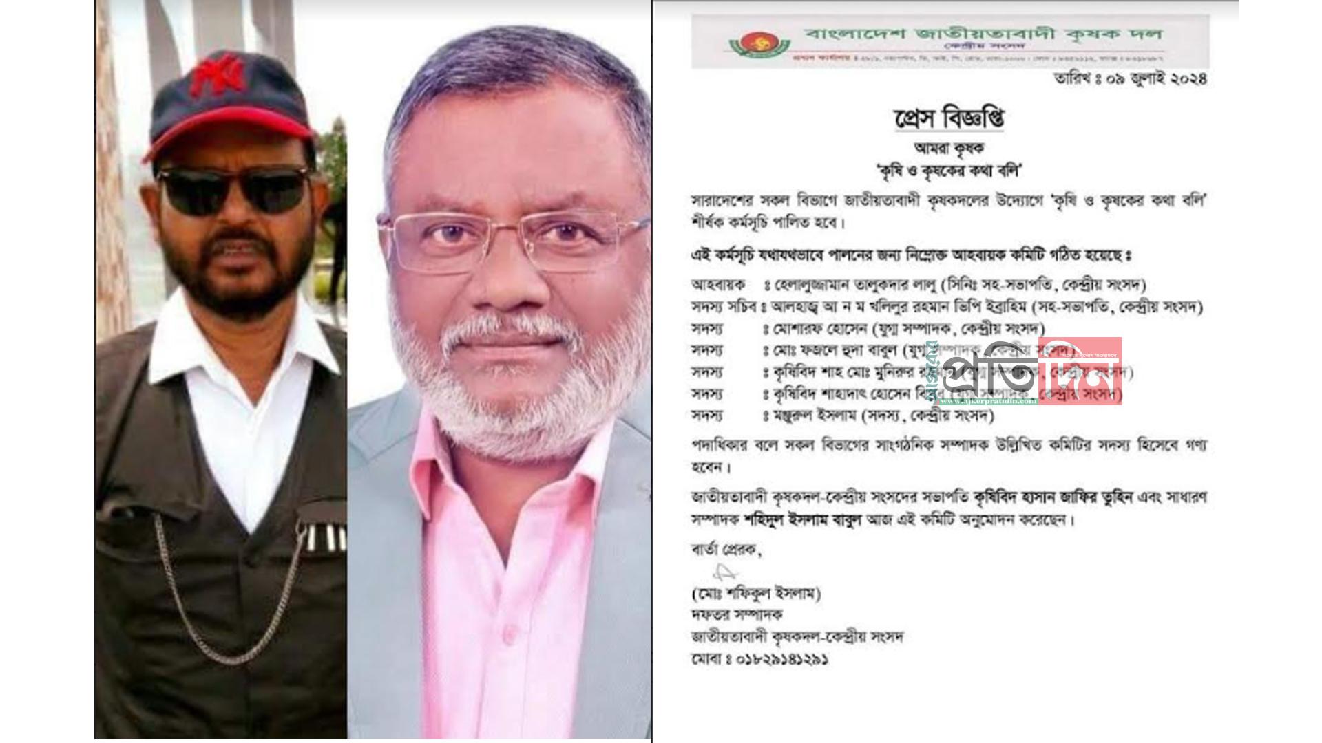 জাতীয়তাবাদী কৃষক দলের কেন্দ্রীয় কমিটির সিনিয়র সহ সভাপতি হেলালুজ্জামান তালুকদার লালু ক আহবায়ক ও জাতীয়বাদী কৃষক দলের কেন্দ্রীয় কমিটির সহ সভাপতি আলহাজ্ব আ ন ম খলিলুর রহমান ভিপি ইব্রাহিম কে সদস্য সচিব করে ৫ সদস্য বিশিষ্ট কমিটি গঠন করা হয়েছে। পদাধিকার বলে সকল বিভাগের সাংগঠনিক সম্পাদক উল্লেখিত কমিটির সদস্য হিসেবে গন্য হবেন।