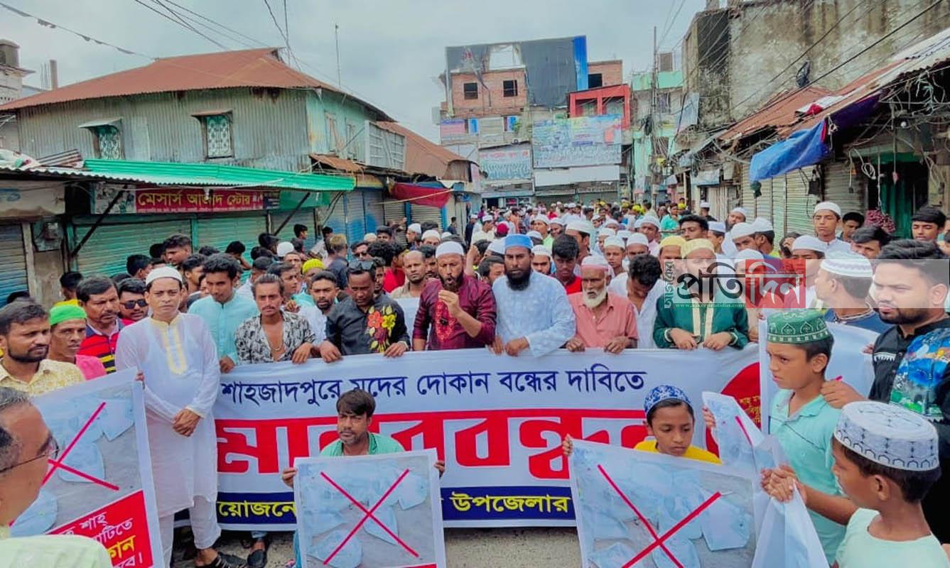 জুম্মার নামাজ পর বিভিন্ন মসজিদের মুসল্লিারা ও মাদ্রাসার শিক্ষক ও ছাত্ররা খন্ড খন্ড বিক্ষোভ মিছিল নিয়ে শাহজাদপুর উপজেলার পৌর সদরের দ্বারিয়াপুর বাজারের বাটারমোড় এলাকায় সমবেত হয়। এরপর এখানে মদের দোকান বন্ধের দাবীতে মানববন্ধন করে। আধাঘন্টা ব্যাপী মানববন্ধন চলাকালে তারা মদের দোকান অবিলম্বে বন্ধের দাবীতে শ্লোগান দিয়ে বিক্ষোভ প্রদর্শন করে। এরপর একই দাবীতে ওই স্থানে একটি বিশাল সমাবেশ অনুষ্ঠিত হয়।