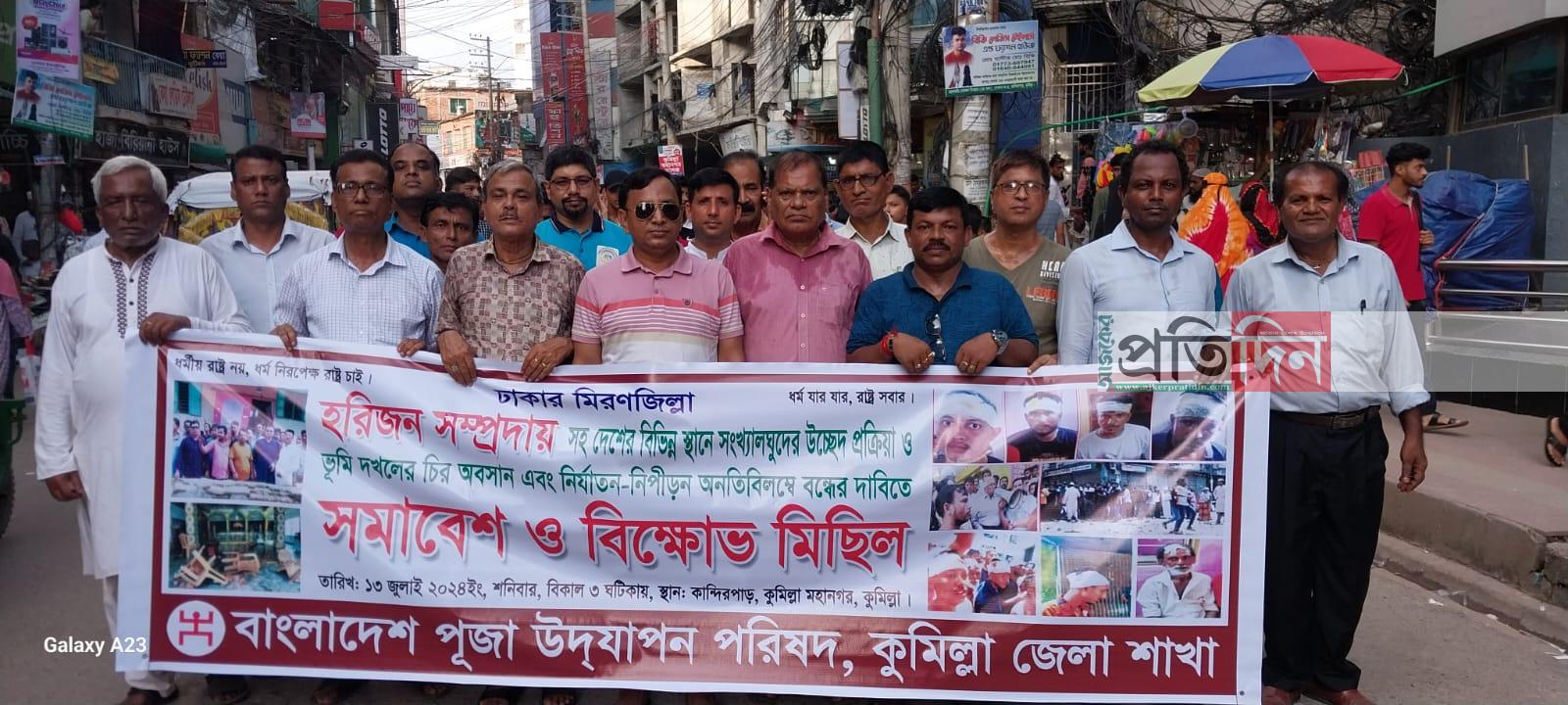 ঢাকার বংশাল থানাধীন মিরনজিল্লা হরিজন পল্লীর শতাধিক বাড়িঘরে ভাঙচুর, লুটপাট ও উচ্ছেদসহ দেশের বিভিন্ন স্থানে সংখ্যালঘুদের উচ্ছেদ প্রক্রিয়া ভূমি দখলের চির অবসান, নির্যাতন-নিপীড়ন অবিলম্বে বন্ধের দাবীতে কেন্দ্রীয় কর্মসূচীর অংশ হিসেবে সারাদেশের ন্যায় কুমিল্লায়ও শনিবার (১৩ জুলাই) বিকেল ৩টায় নগরীর কান্দিরপাড় পূবালীচত্বরে বাংলাদেশ হিন্দু বৌদ্ধ খ্রিষ্টান ঐক্য পরিষদ, বাংলাদেশ পূজা উদযাপন পরিষদ ও বাংলাদেশ যুব ঐক্য পরিষদ কুমিল্লা জেলা ও মহানগর শাখার এবং হরিজন সম্প্রদায়, কুমিল্লার উদ্যোগে বিক্ষোভ মিছিল ও প্রতিবাদ সমাবেশ অনুষ্ঠিত হয়।