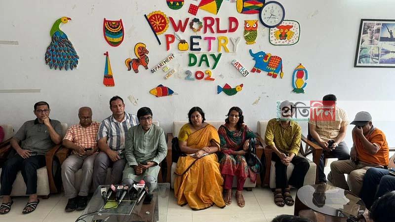 সংবাদ সম্মেলনে ইতিহাস বিভাগের অধ্যাপক পারভীন জলীর সঞ্চালনায় পরিবেশবিজ্ঞান বিভাগের অধ্যাপক জামাল উদ্দিন বলেন, আমরা স্পষ্ট দেখতে পেয়েছি, প্রশাসনের নির্দেশেই আক্রমণ করে শিক্ষার্থীদের আহত করা হয়েছে। সংগত কারণে এই প্রশাসন একটা লোকদেখানো তদন্ত কমিটি করে জাতিকে বোঝাতে চাচ্ছে তারা কী করছে। দেশের প্রধানমন্ত্রী ঠিক যেভাবে মায়াকান্না করছেন, আমাদের বিশ্ববিদ্যালয়ের প্রশাসনও তাই করছে। সংগত কারণে এই প্রশাসনকে আমরা ক্যাম্পাসে অবাঞ্ছিত ঘোষণা করছি।