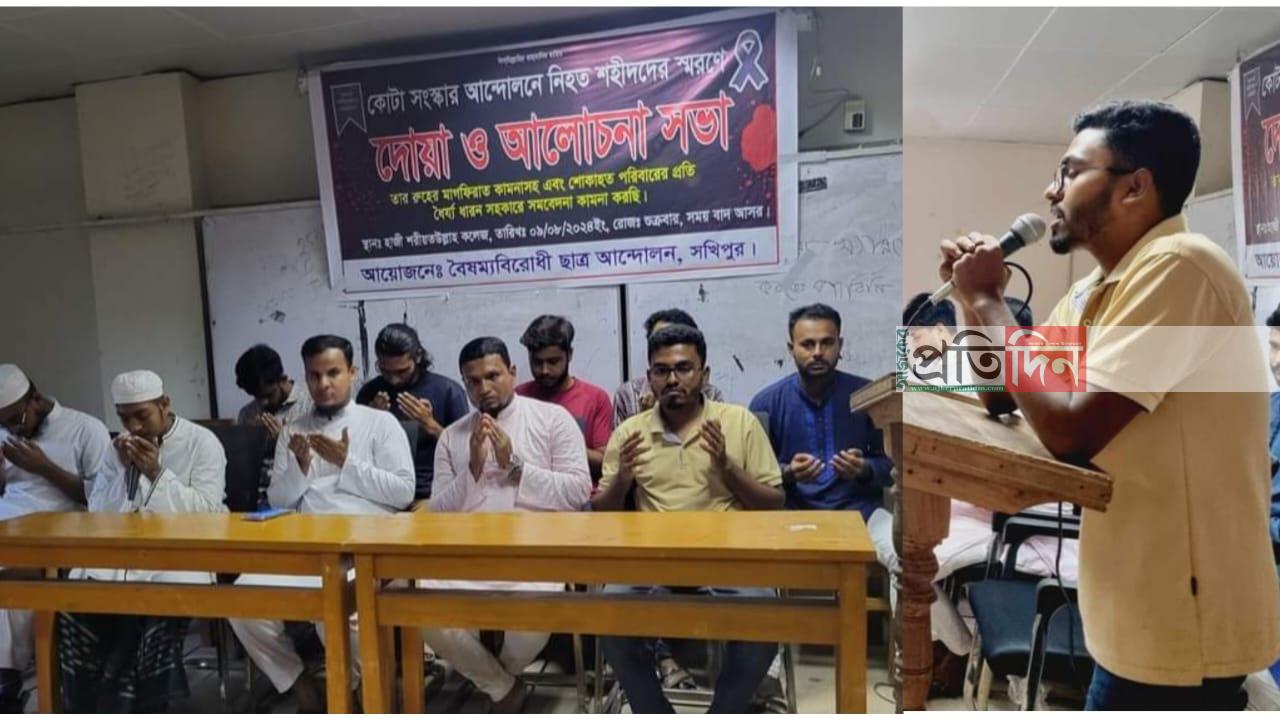 শুক্রবার (৯ আগস্ট) বাদ আসর হাজী শরীয়তউল্যাহ কলেজ প্রাঙ্গণে এ দোয়া ও আলোচনা সভা অনুষ্ঠিত হয়। শরীয়তপুর জেলা বৈষম্যবিরোধী ছাত্র আন্দোলনের সমন্বয়ক রহমতউল্লা নিহালের সভাপতিত্বে অনুষ্ঠানে বক্তব্য রাখেন, ভেদরগঞ্জ উপজেলা স্থাস্থ্য কমপ্লেক্সের সহকারী সার্জন ডা. আব্দুর রাজ্জাক, ব্যাংকার আলাউদ্দিন সরকার, সরকারি প্রাথমিক বিদ্যালয়ের শিক্ষক কাওসার আহমেদ প্রমূখ।