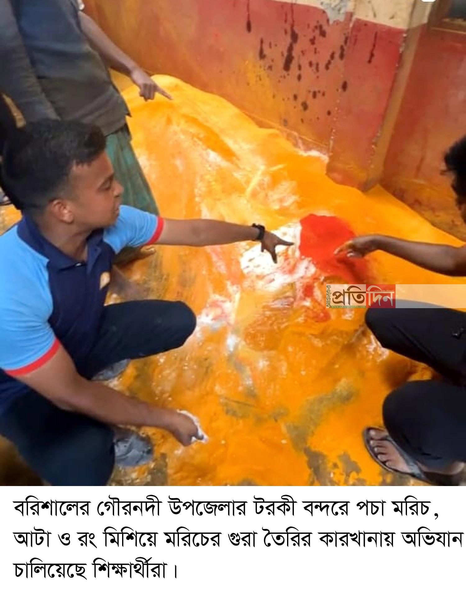 সাধারণ শিক্ষার্থী সানাউল হাওলাদার বলেন, শনিবার দুপুরে হলুদ, মরিচের গুরা তৈরির কারখানা গুলোতে গেলে শাহ আলম (মেম্বার) খানের কারখানায় পচা মরিচ, আটা ও রং মিশ্রিত গুরা হলুদ, মরিচ দেখতে পায় শিক্ষার্থীরা।