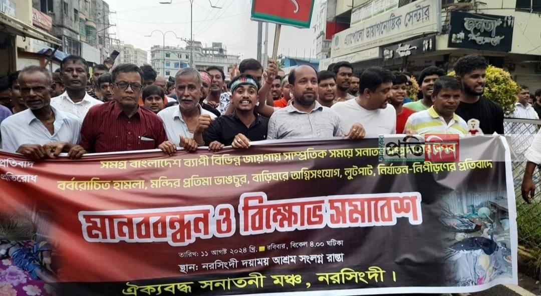 নরসিংদীতে সনাতন ধর্মাবলম্বীদের নিযাতনের প্রতিবাদে সমাবেশ ও মানববন্ধন