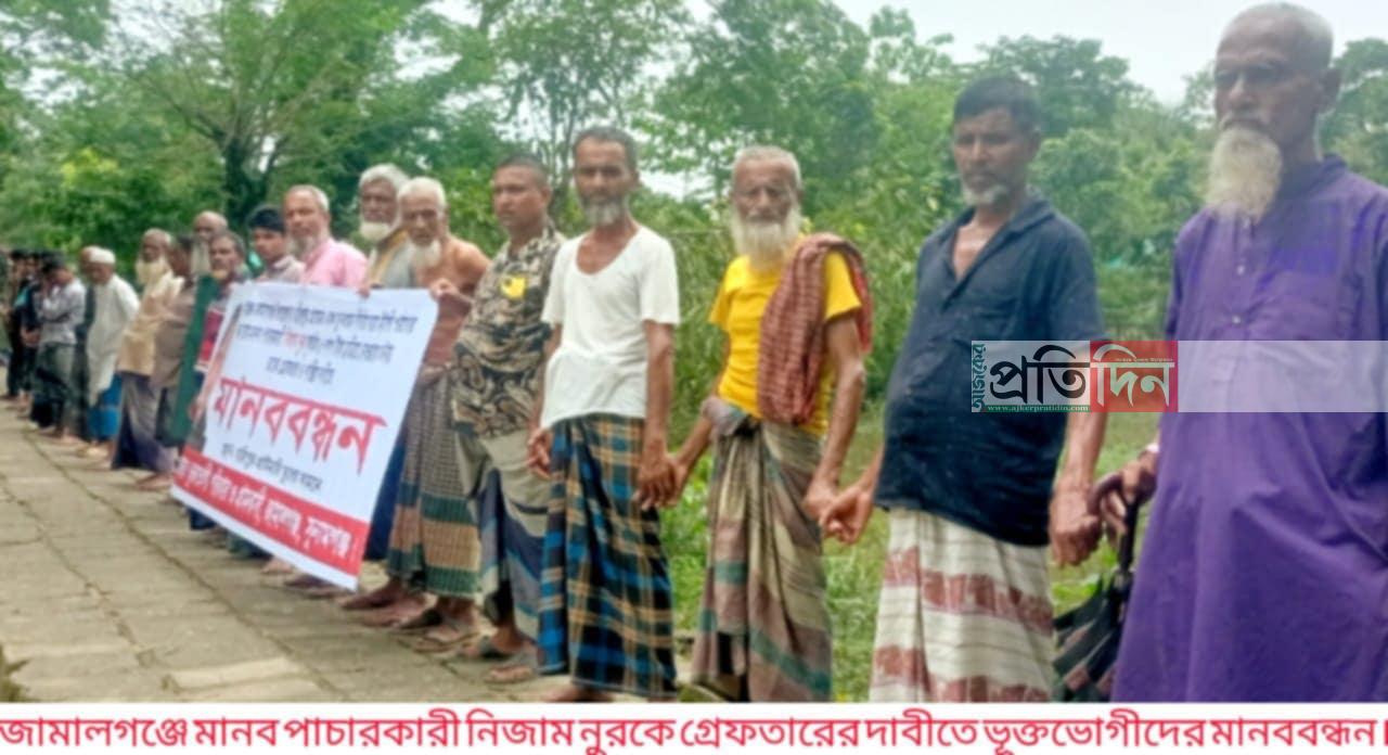 জামালগঞ্জে প্রতারক নিজাম নুরের বিরুদ্ধে ৫ লাখ টাকা আত্মসাতের ঘটনায় তার গ্রেপ্তার ও শাস্তির দাবীতে মানববন্ধন
