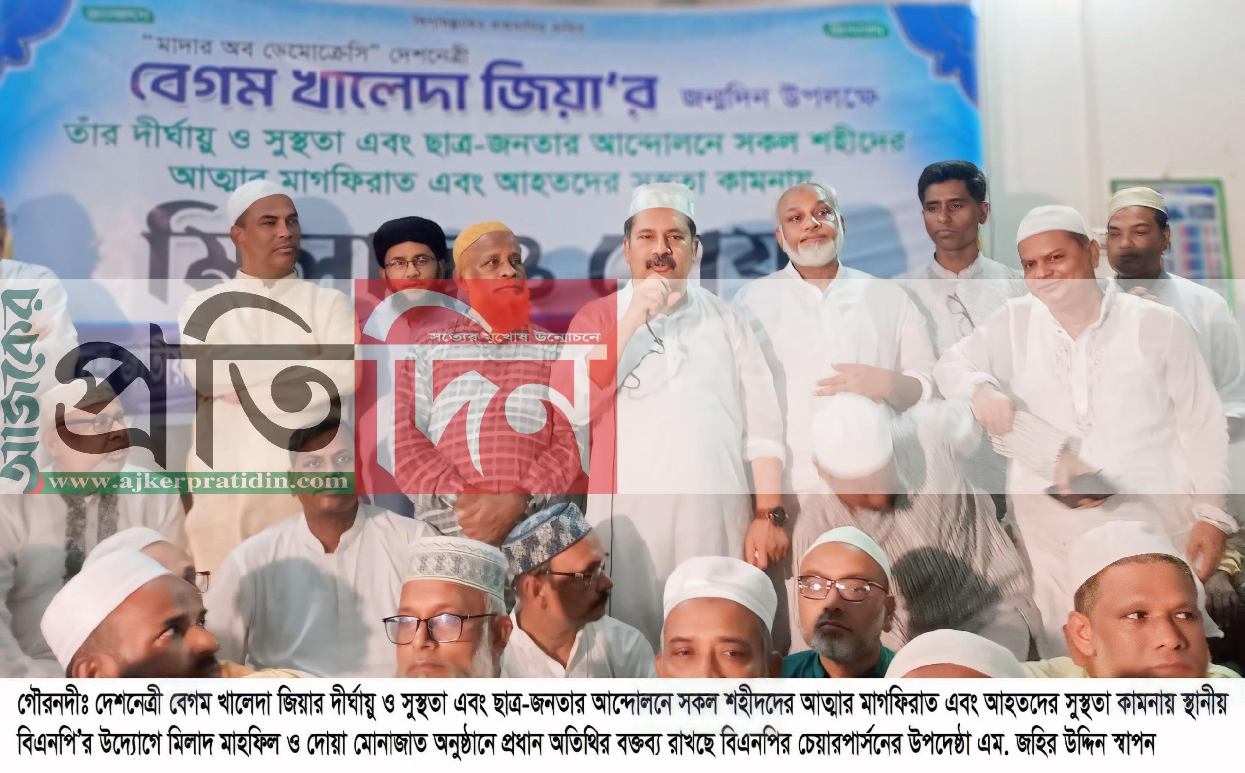 দেশনেত্রী বেগম খালেদা জিয়ার দীর্ঘায়ু ও সুস্থতা এবং ছাত্র-জনতার আন্দোলনে সকল শহীদদের আত্মার মাগফিরাত এবং আহতদের সুস্থতা কামনায় শুক্রবার বিকেলে স্থানীয় বিএনপি’র উদ্যোগে বরিশালের গৌরনদীতে মিলাদ মাহফিল ও দোয়া মোনাজাত অনুষ্ঠিত হয়েছে।