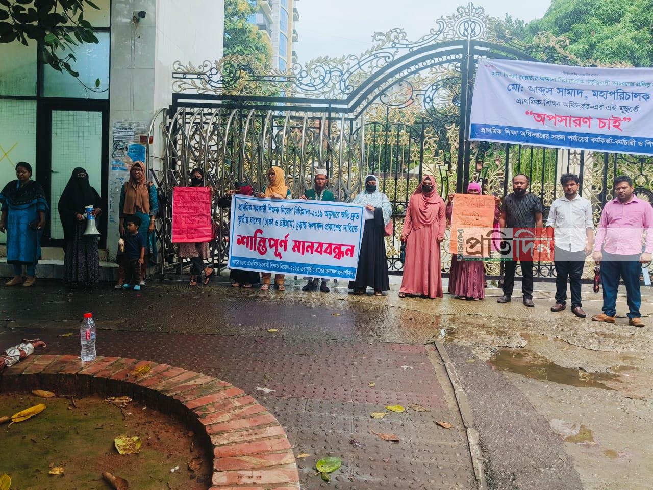 সরকারি প্রাথমিক বিদ্যালয়ের সহকারি শিক্ষক নিয়োগ-২০২৩ এর তৃতীয় ধাপের জন্য ঢাকা ও চট্টগ্রাম বিভাগের চূড়ান্ত ফলাফল প্রত্যাশীরা অদ্য ৩রা সেপ্টেমবর মিরপুর প্রাথমিক শিক্ষা অধিদপ্তরের সামনে একটি শান্তিপূর্ন মানববন্ধন করেন।
