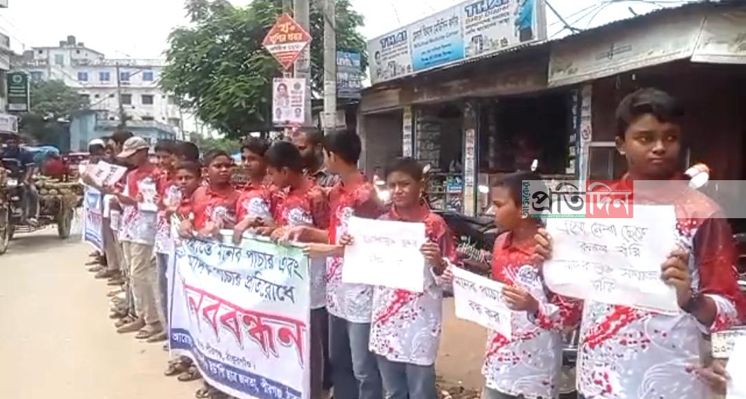 ঠাকুরগাঁওয়ের পীরগঞ্জে সকল প্রকার শান্তিশৃঙ্খলা রক্ষা,মাদক ও দূর্নীতির বিরুদ্ধে ঐক্যবদ্ধ হয়ে প্রতিরোধ গড়ে তোলার লক্ষ্যে মানববন্ধন ও মিছিল অনুষ্ঠিত হয়েছে। বুধবার (৪ আগস্ট) সকালে সাধারণ ছাত্র-জনতা ও এলাকাবাসী এ কর্মসূচী পালন করেন।