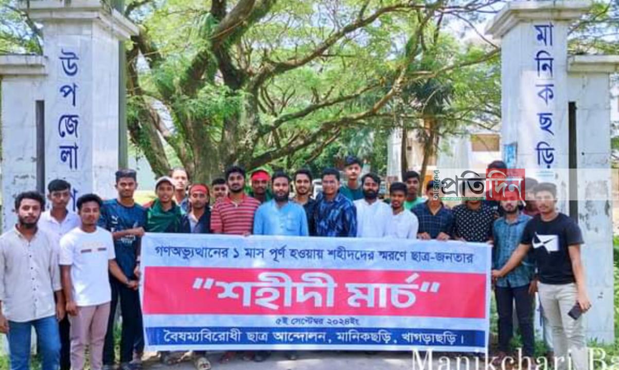 ছাত্র-জনতার গণঅভ্যুত্থাণের একমাস পূর্তি উপলক্ষে এবং স্বৈরাচার সরকার পতনের আন্দোলনে শহীদদের স্মরণ ও আহতদের প্রতি শ্রদ্ধা জানিয়ে বৈষম্যবিরোধী ছাত্র আন্দোলনের উদ্যোগে সারাদেশের ন্যায় শহীদী মার্চ কর্মসূচির অংশ হিসেবে খাগড়াছড়ি জেলায় মানিকছড়ি শহীদী মার্চ করেছে ছাত্র-জনতা।