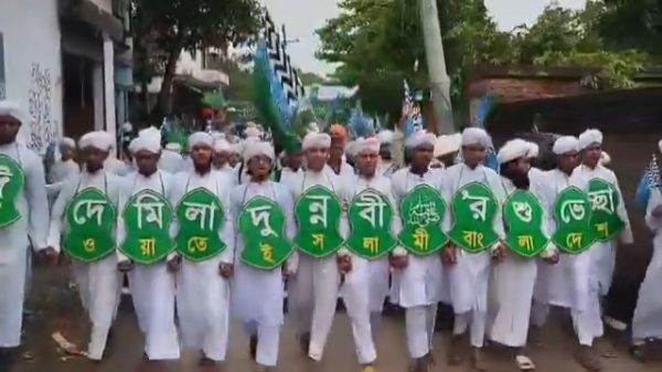 মুন্সীগঞ্জ প্রতিনিধিঃ পবিত্র ঈদে মিলাদুন্নবী (সা:) সাল্লাল্লাহু আলাইহি ওয়াসাল্লাম উপলক্ষে দা’ওয়াতে ইসলামী বাংলাদেশ মুন্সীগঞ্জ জেলার উদ্যোগে বিশাল জশনে জুলুস বের করেছে। সোমবার (১৬ সেপ্টেম্বর) জেলা শহরের পশ্চিম দেওভোগ আলা হযরত রোড, মাদরাসাতুল মদিনা ও জামিয়াতুল মদিনা থেকে বের হয় জশনে জুলুস।