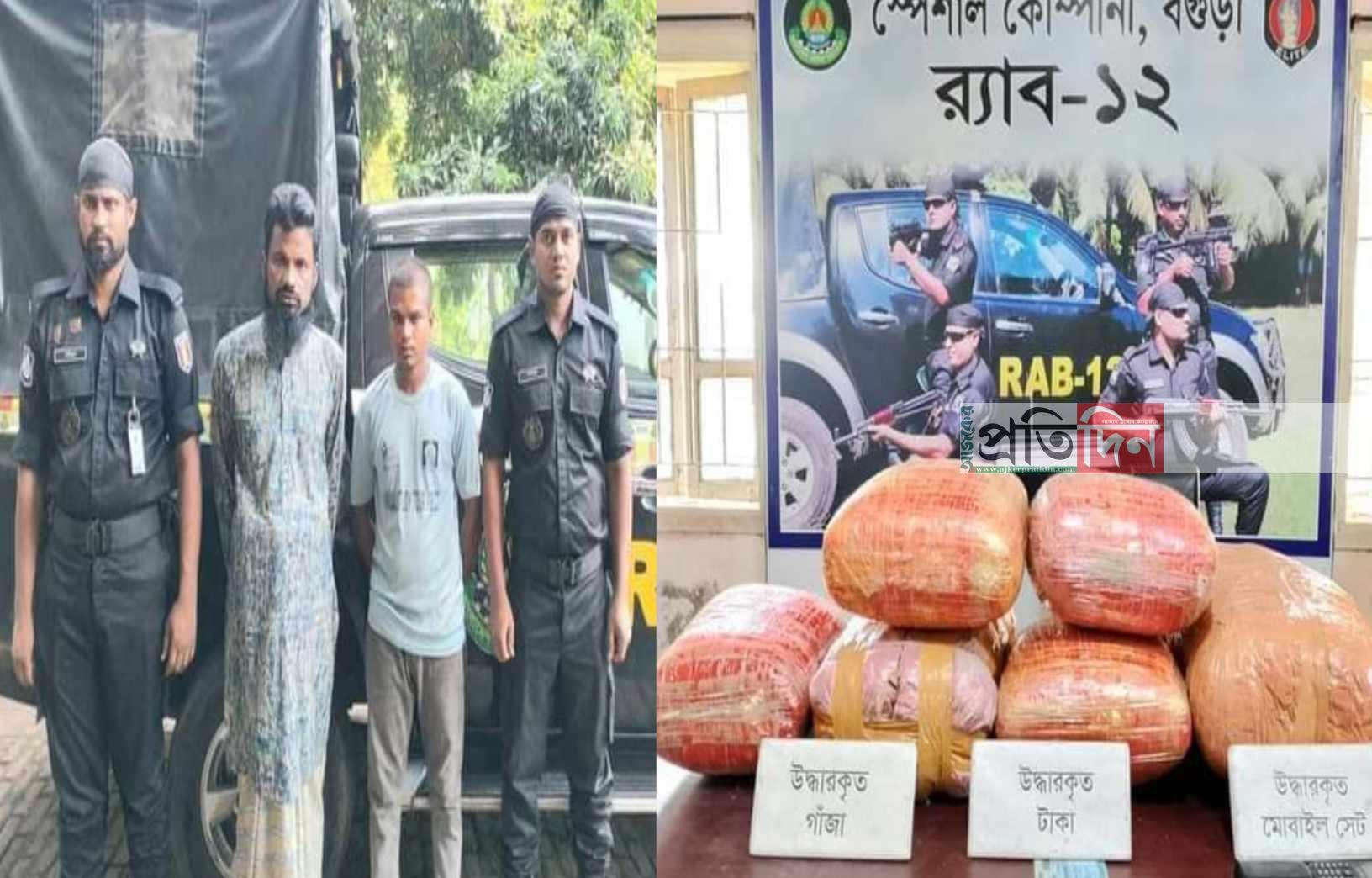 বুধবার ১৮ সেপ্টেম্বর র্যাব-১২, সিপিএসসি বগুড়ার একটি আভিযানিক দল শেরপুর উপজেলার কুসুম্বী ইউনিয়নের বানীয়া গোন্দাইল গ্রামস্থ জনৈক মোঃ শাহ আলম (৫০) এর বসত বাড়ির সামনে শেরপুর টু নন্দীগ্রাম গামী সড়কে অভিযান পরিচালনা করে আসামী (১) ড্রাইভার মোঃ কামরুল ইসলাম (২৩), পিতা-মোঃ দেলোয়ার হোসেন, ঠিকানা- হরিনারয়ণপুর, ইসলামী বিশ্ববিদ্যালয় (ইবি), থানা ও জেলা-কুষ্টিয়া ও (২) মোঃ রহিজ উদ্দিন (৩৬), পিতা-মৃতঃ মকবুল হোসেন, ঠিকানাঃ উত্তরকাশিপুর, থানা-ফুলবাড়ি, জেলা-কুড়িগ্রাম। দুজনকে তাদের বিশেষ কায়দায় রক্ষিত ৩৩ কেজি ২০০ গ্রাম গাঁজা, ১টি পিকআপ, ৩ টি মোবাইল, ৫টি সীম ও নগদ ৭০০ টাকাসহ গ্রেফতার করে।