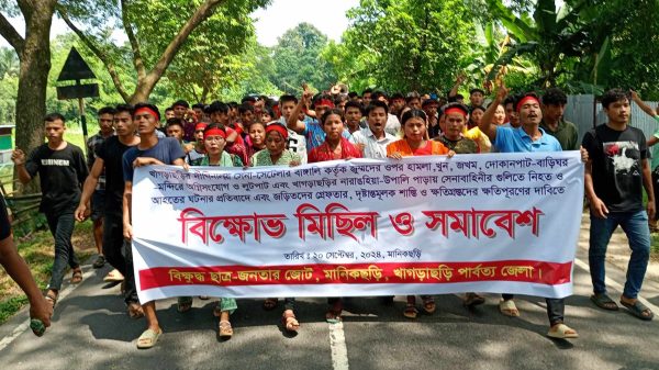 খাগড়াছড়ি সদরে ও দিঘীনালায় হত্যা ও হামলার প্রতিবাদে মানিকছড়িতে বিক্ষোভ মিছিল ও প্রতিবাদ সমাবেশ করেছে বিক্ষুদ্ধ ছাত্র- জনতা জোট।