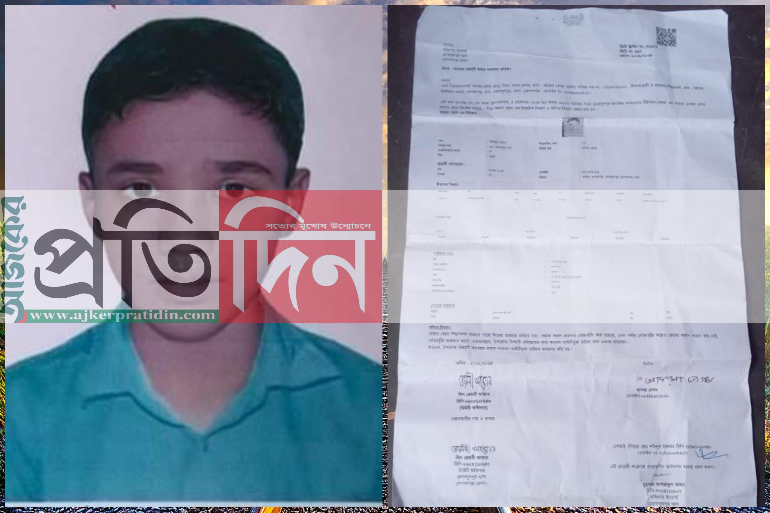 গত ০৫ সেপ্টেম্বর ২০২৪ তারিখে আনুমানিক সকাল ৯:০০ ঘটিকায় গোপালগঞ্জ জেলার মুকসুদপুর থানার খান্দারপাড়া ইউনিয়নের ঝলকশিমুলতলা গ্রামের ছেলে। শিমুলতলা এলাকা থেকে নিখোঁজ হয়েছে। নিখোঁজের সময় তার পরনে ছিল হাফ হাতা স্কুল ড্রেস শার্ট প্যন্ট। তার গায়ের বর্ণ শ্যামলা, চিকন উচ্চতা ৪ ফিট ২ইঞ্চি।