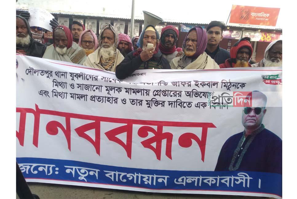 কুষ্টিয়া দৌলতপুরে যুবলীগের সাবেক সহ-সভাপতি জাফর ইকবাল মিঠুনের মিথ্যা ও সাজানো মূলক মামলায়। গ্রেফতার এর অভিযোগে এবং মিথ্যা মামলা প্রত্যাহার ও মুক্তির দাবিতে আজ সকাল আনুমানিক ৮ টা ৩০ মিনিটে কুষ্টিয়া দৌলতপুরে ডাংমড়কা, বাগোয়ান। ডক্টর ফজলুল হক গার্লস ডিগ্রী কলেজ এর সামনে মানববন্ধন হয়েছে।
