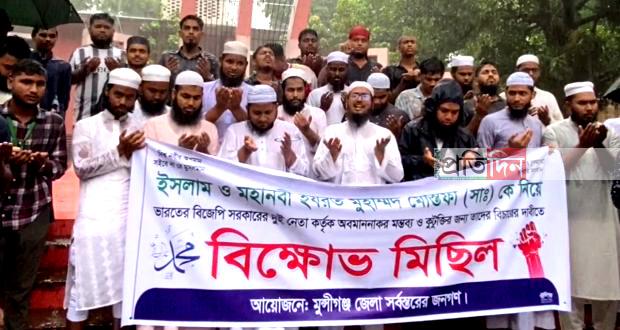 মুন্সীগঞ্জে মহানবীর অবমাননার প্রতিবাদে বৃষ্টি উপেক্ষা করে সড়কে বিক্ষোভ