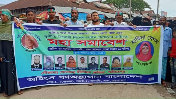 গত রবিবার ০৬ অক্টোবর বিকেলে শরীয়তপুর জেলার জাজিরা উপজেলার কাজীর হাট বন্দরে উক্ত সমাবেশটি অনুষ্ঠিত হয়। অহিংস গণঅভ্যুত্থান বাংলাদেশ এর শরীয়তপুর জেলা কমিটির আহ্বায়ক মোসা: হাছিনা বেগমের নেতৃত্ব মহা সমাবেশের আয়োজন করেন। তিনি বলেন কৃষক, শ্রমিক, হকার, বেকার, তথা সকল জণগণের কাছ থেকে সরকারি রাজস্ব ভ্যাট ট্যাক্স আদায় করা লক্ষ কোটি টাকা ক্ষমাতাশ্রিত একটা হায়নার দল, স্বাধীনতার পর থেকেই লুটপাট করে আসছে।