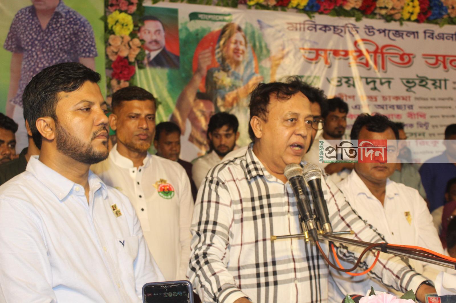বুধবার (১৩ নভেম্বর) উপজেলা সদরের টাউন হল প্রাঙ্গণে বিকেলে মানিকছড়ি উপজেলায় জাতীয়তাবাদ দল বিএনপির উদ্যোগে আয়োজনে সম্প্রীতি সমাবেশে তিনি আরো বলেন, বিএনপি ক্ষমতায় আসার ভিত্তি হলো জনগণ। আর আ.লীগ বারবার ক্ষমতায় আসছে সরকার যন্ত্র ব্যবহার করে। তারা আয়নার ঘর বানিয়ে খুন-ঘুমের রাজনৈতিক করেছে। এদেশের মানুষকে নানা ভাবে নিপীড়ন নির্যাতন চালিয়ে কোটি কোটি টাকা ব্যাংক ব্যলেন্স করেছে। দীর্ঘ ১৭ বছর মানিকছড়িতে আসতে দেয়নি আ.লীগের গুন্ডা বাহিনীর। কিন্তু আজকের সম্প্রীতি সমাবেশে প্রমাণ করেছে মানিকছড়ির মাটি এখন বিএনপির ঘাঁটি। তাই আগামীর সকল আন্দোলন সংগ্রামে সকল সম্প্রদায়ের মানুষকে একসাথে কাজ করার আহ্বান জানান।