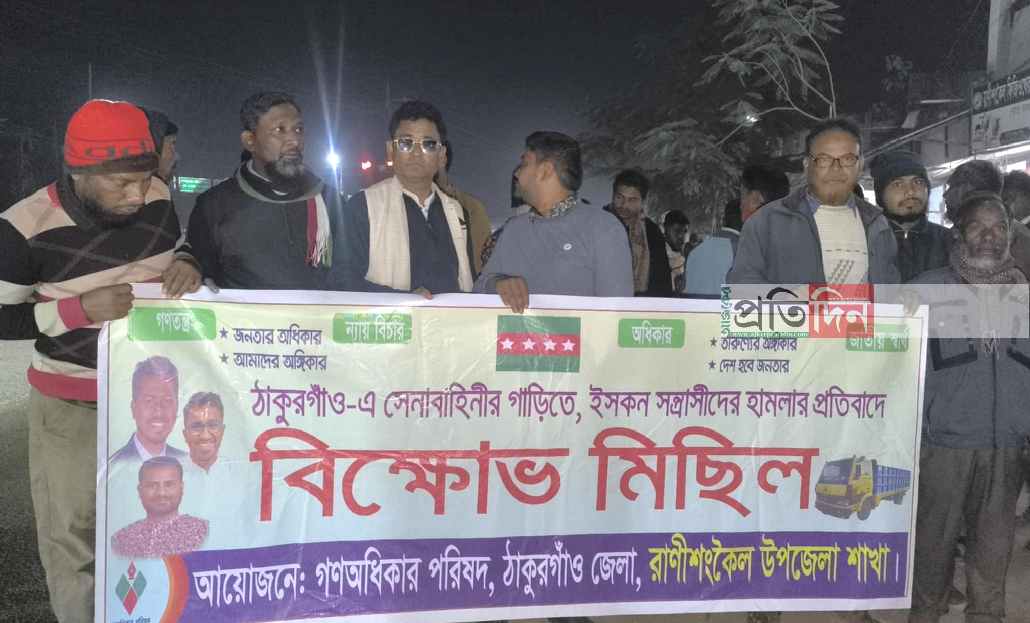 রাণীশংকৈল (ঠাকুরগাঁও) প্রতিনিধি।। ঠাকুরগাঁওয়ে মঙ্গলবার ২৬ নভেম্বর সেনাবাহিনীর গাড়িতে, ইসকন সদস্যদের হামলার প্রতিবাদে রাণীশংকৈলে বিক্ষোভ মিছিল করেছে গণ অধিকার পরিষদ উপজেলা শাখা। এদিন রাত ৮ টায় এ পরিষদের নেতাকর্মীরা পৌর শহরের শিবদিঘি মোড় থেকে একটি বিক্ষোভ মিছিল বের করে শহরের প্রধান সড়ক প্রদক্ষিণ করে। বিক্ষোভ মিছিলে তারা ইসকন, আওয়ামী লীগ ও জাতীয় পার্টির বিরুদ্ধে বিভিন্ন শ্লোগান দেন।