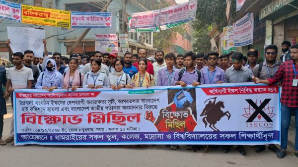 সম্রাট আলাউদ্দিন, ধামরাই (ঢাকা) প্রতিনিধিঃ ঢাকার ধামরাইয়ে উগ্রবাদী সংগঠন ইস্কনের দেশব্যাপি অরাজকতা সৃষ্টি এবং আগরতলায় বাংদেশের হাইকমিশনেনে হামলা ও বাংলাদেশের পতাকার অবমাননার বিরুদ্ধে বিক্ষোভ মিছিল করেছে বিভিন্ন স্কুল, কলেজ ও মাদ্রাসার ছাত্র-ছাত্রীরা।
