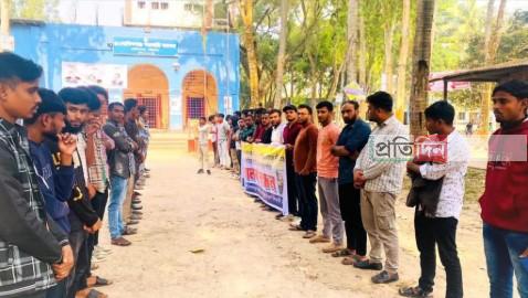 কলেজ ছাত্রদলের আহ্বায়ক মাহমুদ পাঠান বিপুলের সভাপতিত্বে এবং জেলা ছাত্রদলের সদস্য কলেজ ছাত্রদল নেতা নুর আলম প্রধান ও কলেজ ছাত্রদলের সিনিয়র যুগ্ম আহবায়ক তুহিন সরকার সঞ্চালনায় মানববন্ধনে অংশগ্রহণ করেন উপজেলা ছাত্রদল এর আহবায়ক সৈয়দ আল-আমিন রনি, সদস্য সচিব মনির হোসেন সরকার পৌর ছাত্রদলের আহ্বায়ক খাইরুল ইসলাম সদস্য সচিব আরিফুল ইসলাম আরিফ, বৈষম্য বিরোধী ছাত্র আন্দোলনের অন্যতম সমন্বয়ক তাহসিন আহম্মেদ, কলেজ ছাত্রদলের যুগ্ম আহবায়ক সুহিন, আহাদ, জাহিদ, তানভীর, সাধারণ শিক্ষার্থীদের মধ্যে রুহিন সরকার, আকাশ সেখ, আবু তারেক, রোমান সোহেল, নিবরাজ, অরিত তালুকদার, মুহিন ও লিখন প্রমুখ।