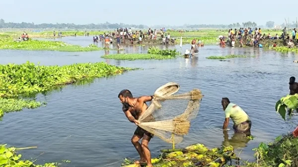 ঠাকুরগাঁও প্রতিনিধি : প্রতি বছরের ন্যায় এবারও ঠাকুরগাঁওয়ে বুড়িবাঁধে ঐতিহ্যবহনকারী মাছ ধরার মহোৎসবে ছুটে এসেছে তিন জেলার হাজারো মানুষ। হাতে জাল, খৈলসা আর ছোট নৌকা। কেউ ভেলায়, কেউবা পানিতে কোমরজল