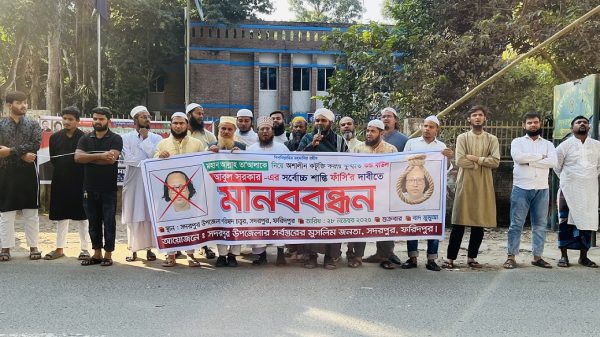 ফরিদপুর প্রতিনিধি : ফরিদপুরের সদরপুরে মহান আল্লাহ তায়ালার প্রতি কটূক্তি ও পবিত্র আল-কোরআনের আয়াত বিকৃতির অভিযোগে শিল্পী আবুল সরকারের ফাঁসি দাবি করে মানববন্ধন অনুষ্ঠিত হয়েছে। শুক্রবার (২৮ নভেম্বর) জুমার নামাজ