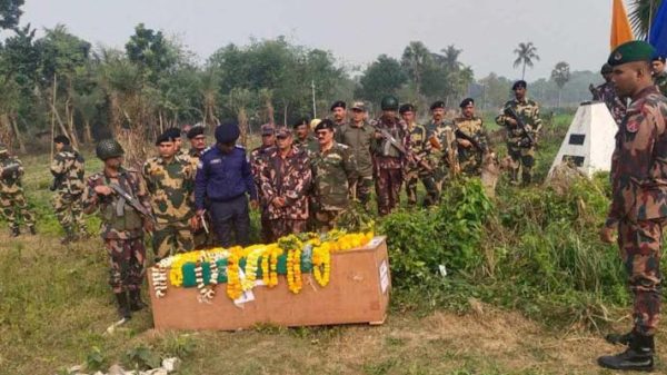 বেনাপোল (যশোর): বেনাপোল ধান্যখোলা সীমান্তে বিএসএফের গুলিতে নিহত বিজিবি সদস্য রইশুদ্দীনের মরদেহ হস্তান্তর করেছে বিএসএফ। বুধবার (২৪ জানুয়ারি) সকাল সাড়ে ১১টায় শার্শার শিকারপুর সীমান্তের মুক্তিযোদ্ধা খামার পাড়া ও ভারতের গাঙ্গুলিয়া সীমান্তের