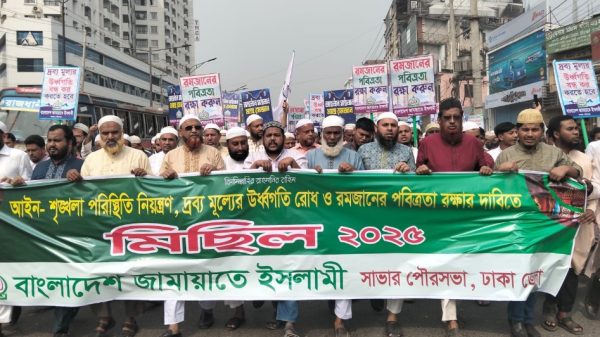 সাভার (ঢাকা) প্রতিনিধি : ঢাকার সাভারে আইন-শৃঙ্খলা পরিস্থিতি নিয়ন্ত্রণ, দ্রব্যমূল্যের ঊর্ধ্বগতি রোধ ও রমজানের পবিত্রতা রক্ষার দাবিতে বিক্ষোভ মিছিল করেছে বাংলাদেশ জামায়াতে ইসলামী। শুক্রবার (২৮ ফেব্রুয়ারি) জুমার নামাজের পর সাভার