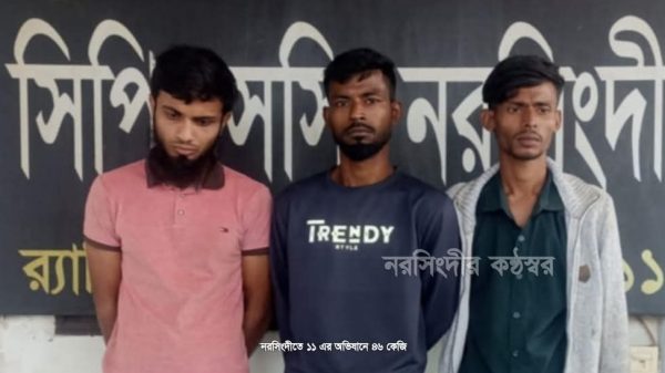 অরবিন্দ রায়, স্টাফ রিপোর্টারঃ নরসিংদীতে বিশেষ অভিযান চালিয়ে ৪৬ কেজি গাঁজা ও একটি পিকআপ জব্দসহ তিন মাদক ব্যবসায়ীকে গ্রেপ্তার করেছে র্যাব ১১ সিপিএসসি। সোমবার (২৪ ফেব্রুয়ারি) নরসিংদী সদরের নতুন বাসস্ট্যান্ড