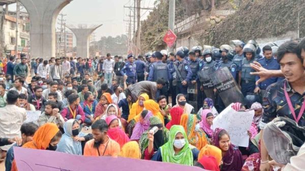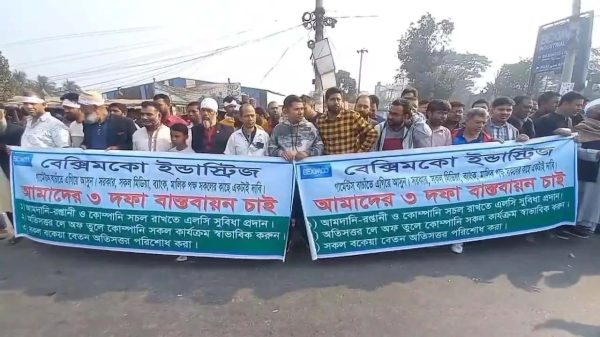 সাভার (ঢাকা) প্রতিনিধি : গাজীপুর মহানগরীর সারাবো এলাকার বেক্সিমকো ইন্ডাস্ট্রিয়াল পার্কের বন্ধ হওয়া ১৬টি কারখানা খুলে দেওয়ার দাবিতে মানববন্ধন করছেন কর্মহীন শ্রমিকেরা। মঙ্গলবার (১৪ জানুয়ারি) সকাল ৯টা থেকে চন্দ্রা-নবীনগর মহাসড়ক