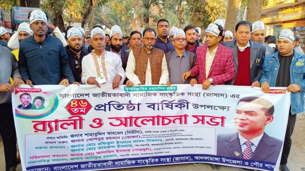 ফরিদপুর প্রতিনিধি : ফরিদপুরের আলফাডাঙ্গায় বাংলাদেশ জাতীয়তাবাদী সামাজিক সাংস্কৃতিক সংস্থার (জাসাস) ৪৬ তম প্রতিষ্ঠাবার্ষিকী উদযাপন করা হয়েছে। দিবসটি উপলক্ষে শুক্রবার (২৭ ডিসেম্বর) বিকালে আলফাডাঙ্গা সদর বাজারের হাসপাতাল রোডে অবস্থিত উপজেলা
