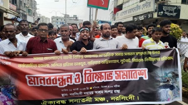 অরবিন্দ রায়, স্টাফ রিপোর্টারঃ বাংলাদেশ চলমান পরিস্থিতিতে হিন্দুদের ওপর বর্বরোচিত হামলা, নির্যাতন, মন্দির, বাড়ি ঘর ভাংচুর, লুটপাট, অগ্নিসংযোগ, জায়গা – জমি দখল সহ সকল প্রকার অন্যায় অত্যাচারের বিরুদ্ধে মানববন্ধন ও