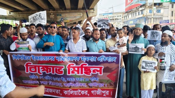 ইউনুস আলী, কালিয়াকৈর (গাজীপুর) প্রতিনিধিঃ ফিলিস্তিনে ইসরায়েলি বাহিনীর বর্বরোচিত হামলার প্রতিবাদে গাজীপুরের কালিয়াকৈর উপজেলার চন্দ্রা ত্রিমোড়ে সোমবার সকাল ১১টায় ছাত্র জনতার ব্যানারে বিক্ষোভ মিছিল অনুষ্ঠিত হয়। এ সময় শত শত
