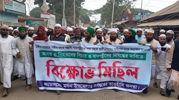 নেত্রকোনা প্রতিনিধি, হাবিবুর রহমান : টঙ্গী ইজতেমার ময়দানে গভীর রাতে সাদা পন্থীদের অতর্কিত ও বর্বরতা হামলায় ৪জন নিহত হয় ও শতাধিক আহত এবং নিখোঁজের ঘটনা জড়িতদের দৃষ্টান্তমূলক শাস্তির দাবিতে নেত্রকোনার