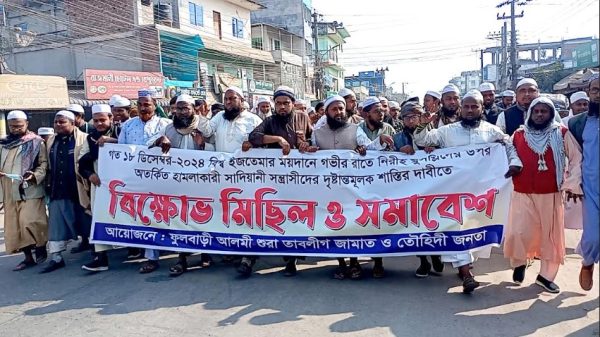 ফুলবাড়ী (দিনাজপুর) প্রতিনিধি : সাদ পন্থীদের কার্যক্রম বাতিলের দাবিতে দিনাজপুরের ফুলবাড়ীতে মানববন্ধন ও বিক্ষোভ মিছিল অনুষ্ঠিত হয়েছে। গত ১৮ ডিসেম্বর বিশ্ব ইজতেমার ময়দানে গভীর রাতে নিরিহ মুসল্লিদের উপর অতর্কিত হামলাকারী