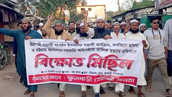 ফুলবাড়ী (দিনাজপুর) প্রতিনিধি : উগ্রপন্থী সন্ত্রাসী সংগঠন ইসকনের সন্ত্রাসী কার্যক্রম,মসজিদে হামলা ও চট্রগ্রাম আদালতে সরকারি আইনজীবি আলিফ হত্যার প্রতিবাদে দিনাজপুরের ফুলবাড়ীতে বিক্ষোভ মিছিল অনুষ্ঠিত হয়েছে। গত (২৭ নভেম্বর) বুধবার বাদ