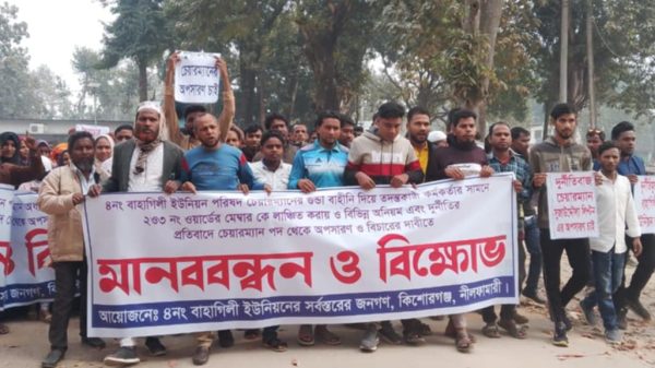 কিশোরগঞ্জ (নীলফামারী) প্রতিনিধি : নীলফামারীর কিশোরগঞ্জে বাহাগিলী ইউনিয়ন পরিষদের চেয়ারম্যান ও জাপা নেতা সুজাউদ্দৌলা লিপটনের বিরুদ্ধে অনিয়ম দুর্নীতি করে অর্ধকোটি টাকা আত্মসাৎ করার অভিযোগ এনে তার অপসারণের দাবিতে মানববন্ধন করেছেন