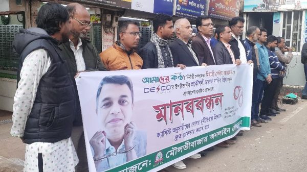 মৌলভীবাজার প্রতিনিধিঃ দৈনিক আমাদের কন্ঠের নির্বাহী সম্পাদক মিয়াজী সেলিম আহমেদ-কে ডেসকোর উপ-বিভাগীয় প্রকৌশলী মারুফ সাদিক প্রিন্স কর্তৃক প্রাণনাশের হুমকির প্রতিবাদে মৌলভীবাজারে মানববন্ধন কর্মসূচি পালিত হয়েছে। মৌলভীবাজার অনলাইন প্রেসক্লাব-এর আয়োজনে (২৫