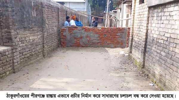 পীরগঞ্জ (ঠাকুরগাঁও) প্রতিনিধিঃ ঠাকুরগাঁওয়ে পীরগঞ্জে চলমান পাকা রাস্তায় হঠাৎ করেই ইটের প্রাচীর নির্মান করে প্রায় ৪০টি পরিবারের চলাচলের পথ বন্ধ করে দেওয়া হয়েছে বলে অভিযোগ উঠেছে। এতে চরম ভোগান্তিতে পড়েছেন