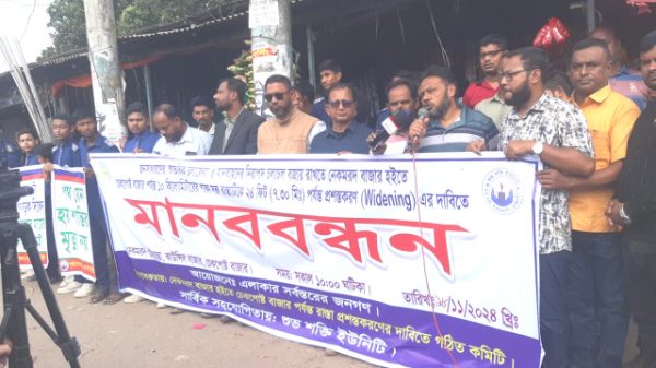 রাণীশংকৈল (ঠাকুরগাঁও) প্রতিনিধিঃ ঠাকুরগাঁওয়ের রানীশংকৈল উপজেলার নেকমরদ বাজার হতে চেকপোস্ট বাজার পর্যন্ত ১০ কিলোমিটার১২ফিট সরু পাকা রাস্তাটি ২৪ ফিটে প্রশস্তকরণের দাবিতে মানববন্ধন কর্মসূচি পালন করেছে এলাকাবাসী। সোমবার (১৮ নভেম্বর) দুপুরে